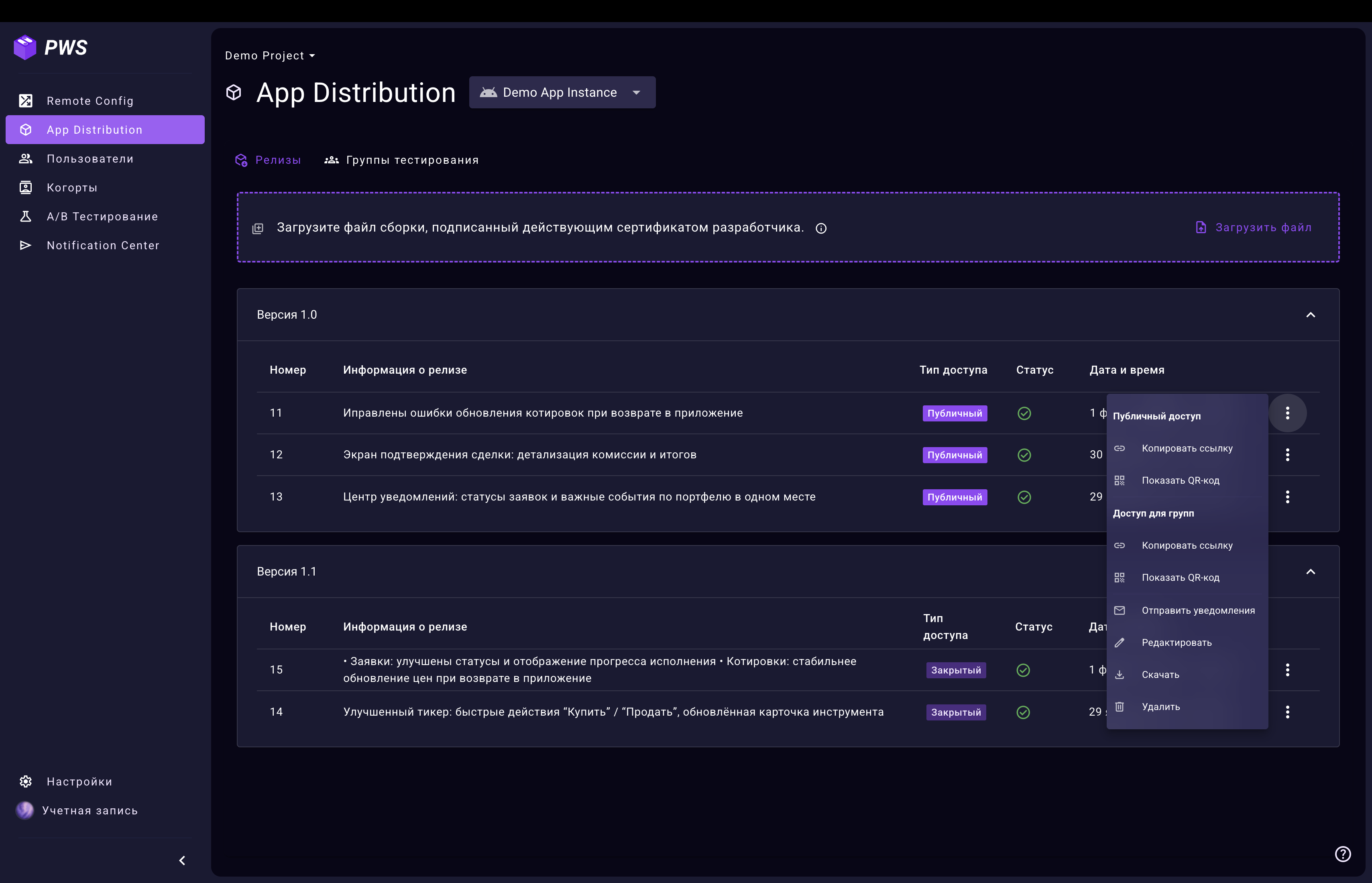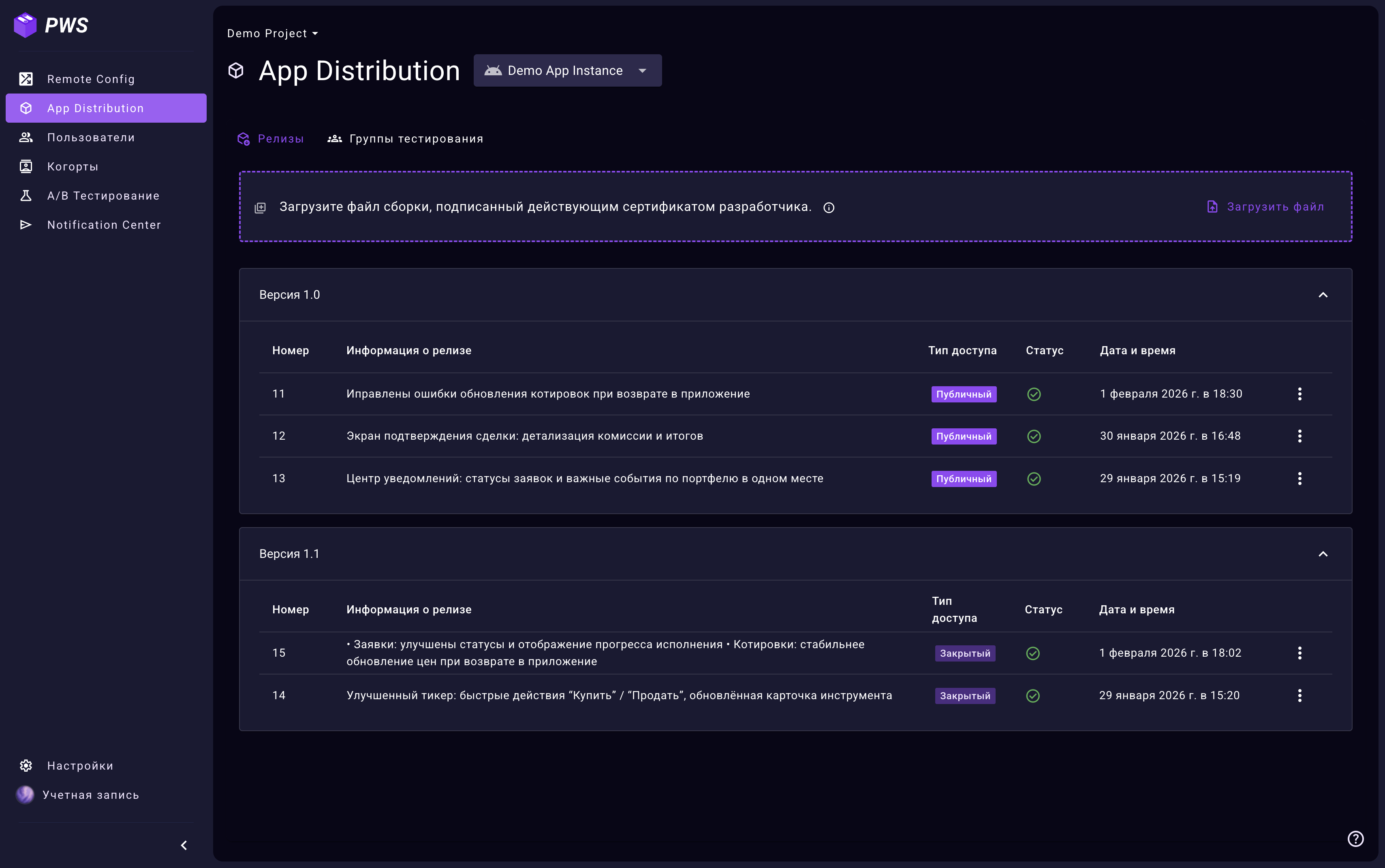 Все загруженные сборки приложения отображаются в списке на вкладке App Distribution. Здесь вы можете просматривать, редактировать и удалять релизы, а также управлять доступом к сборкам.