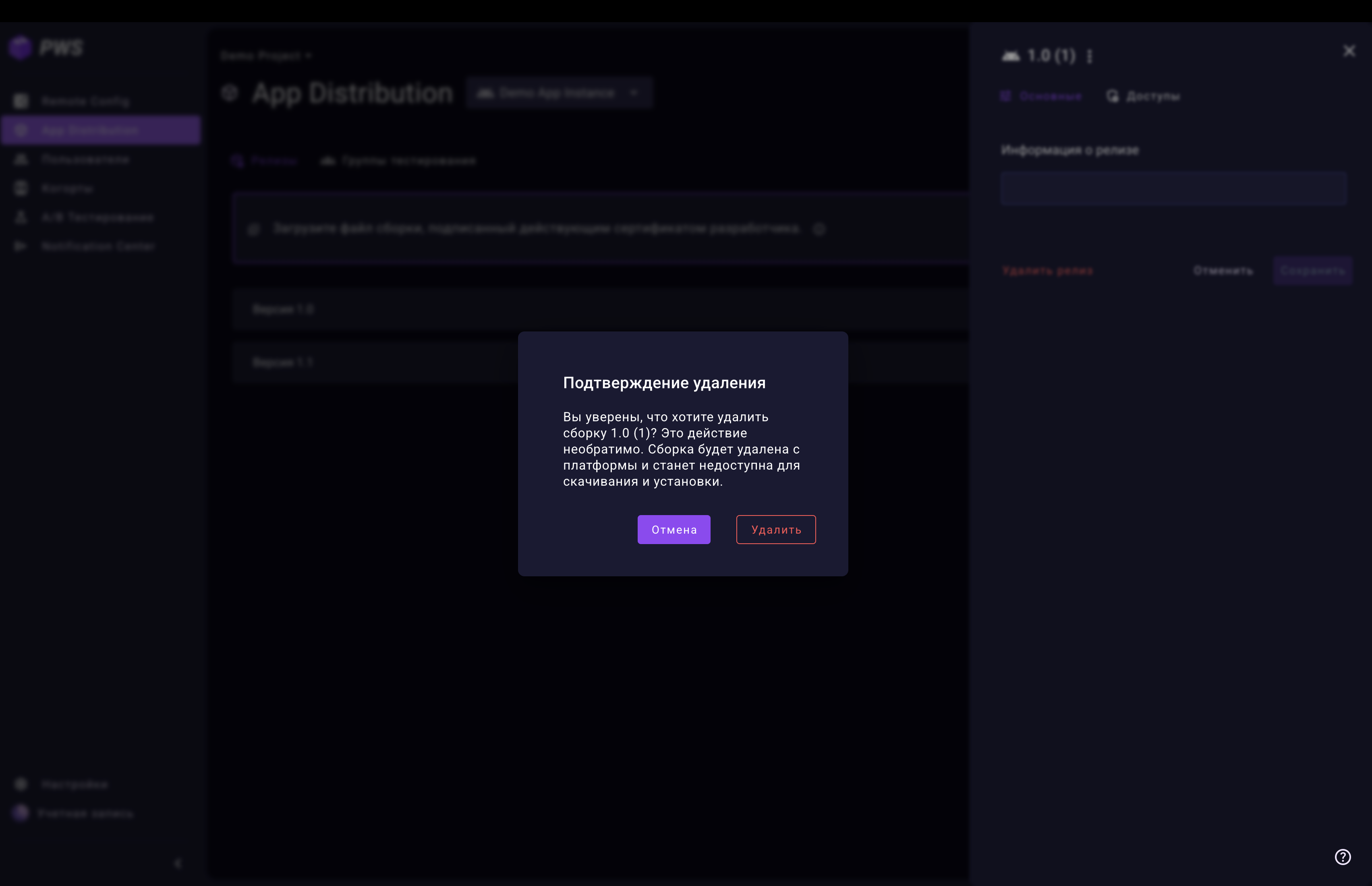 При удалении релиз архивируется — сборка становится недоступной для скачивания, но история сохраняется для аудита.