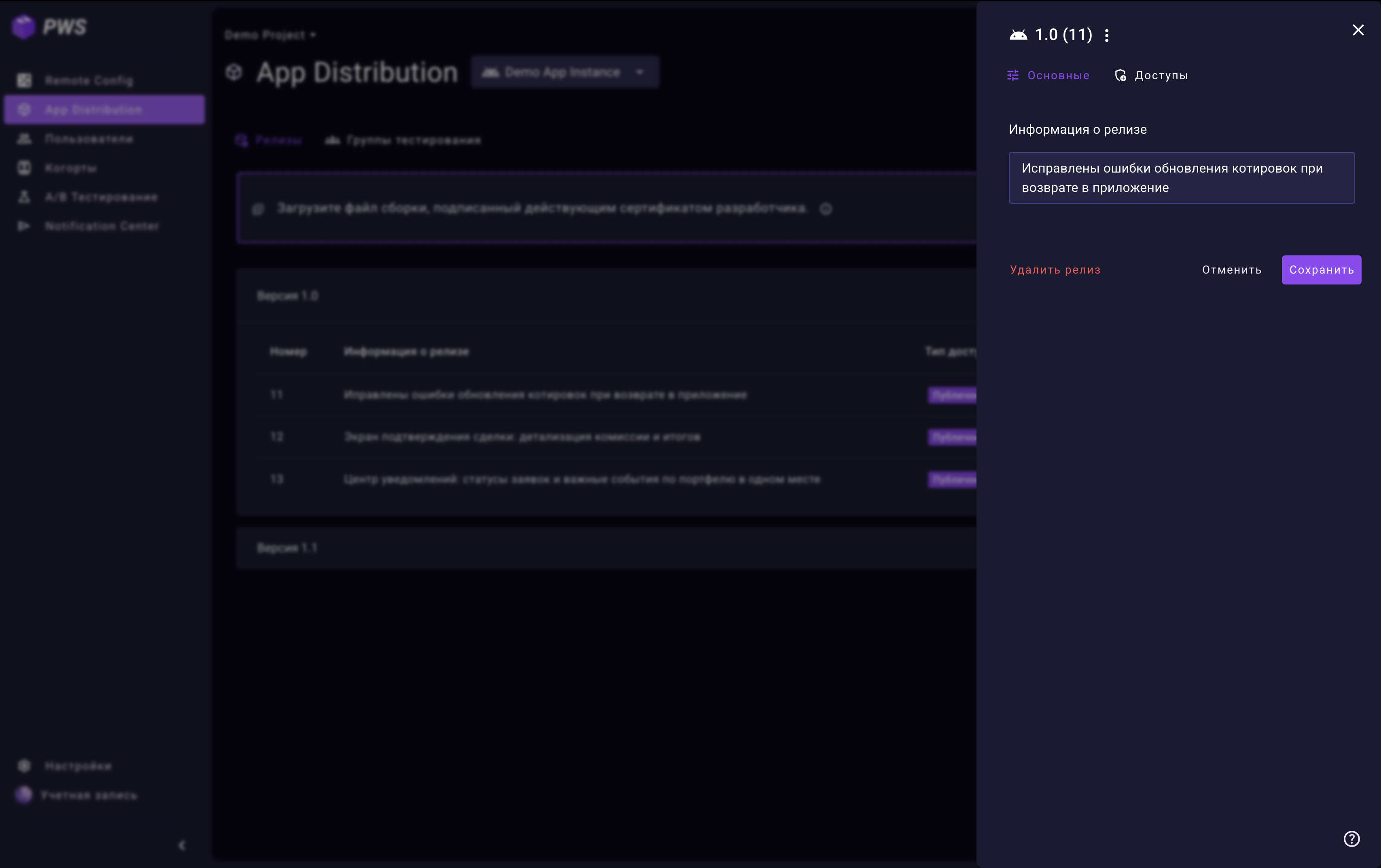 Вкладка «Основные» — отредактируйте информацию о релизе. Изменения отобразятся в PWA для тестировщиков.