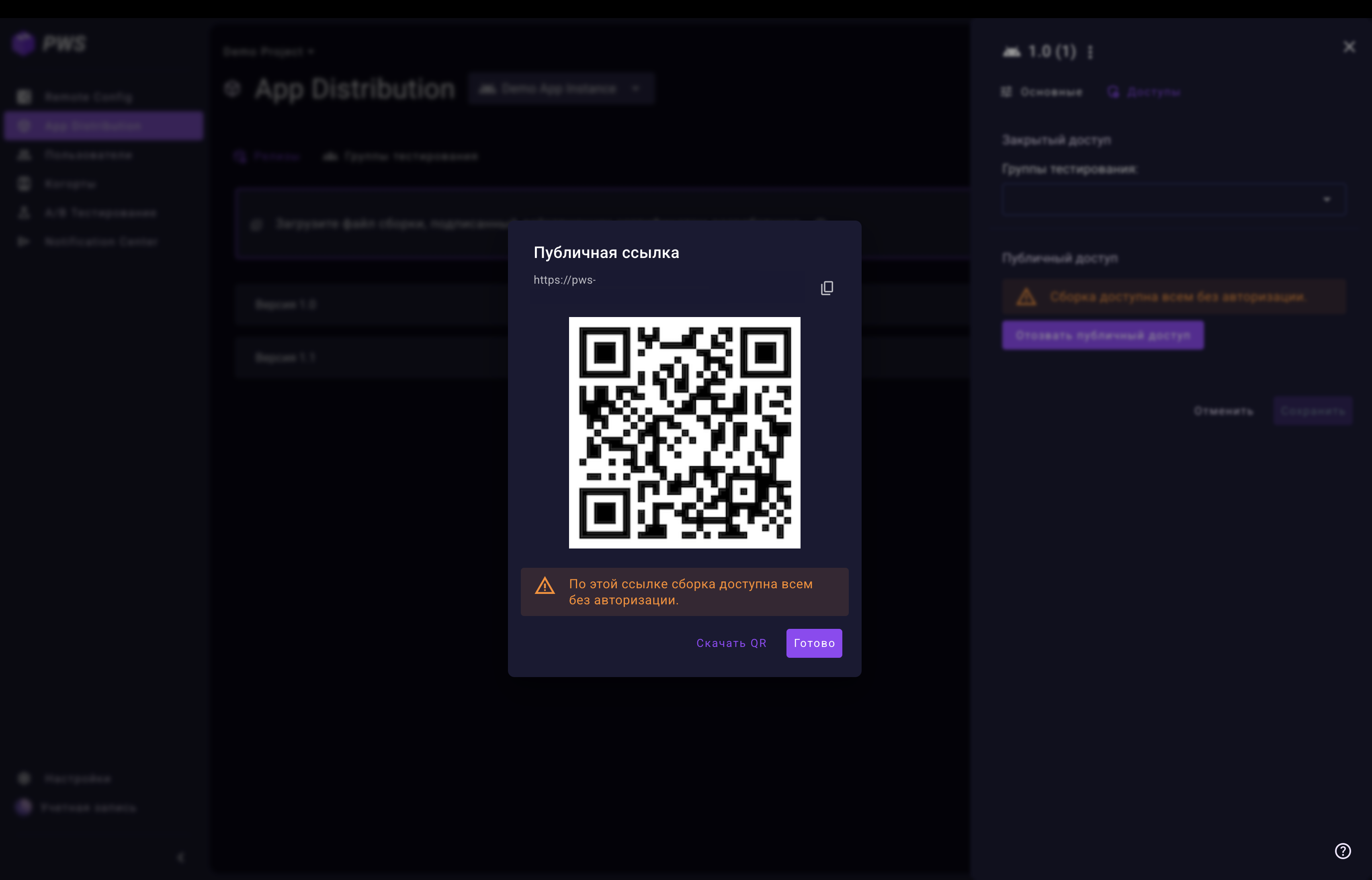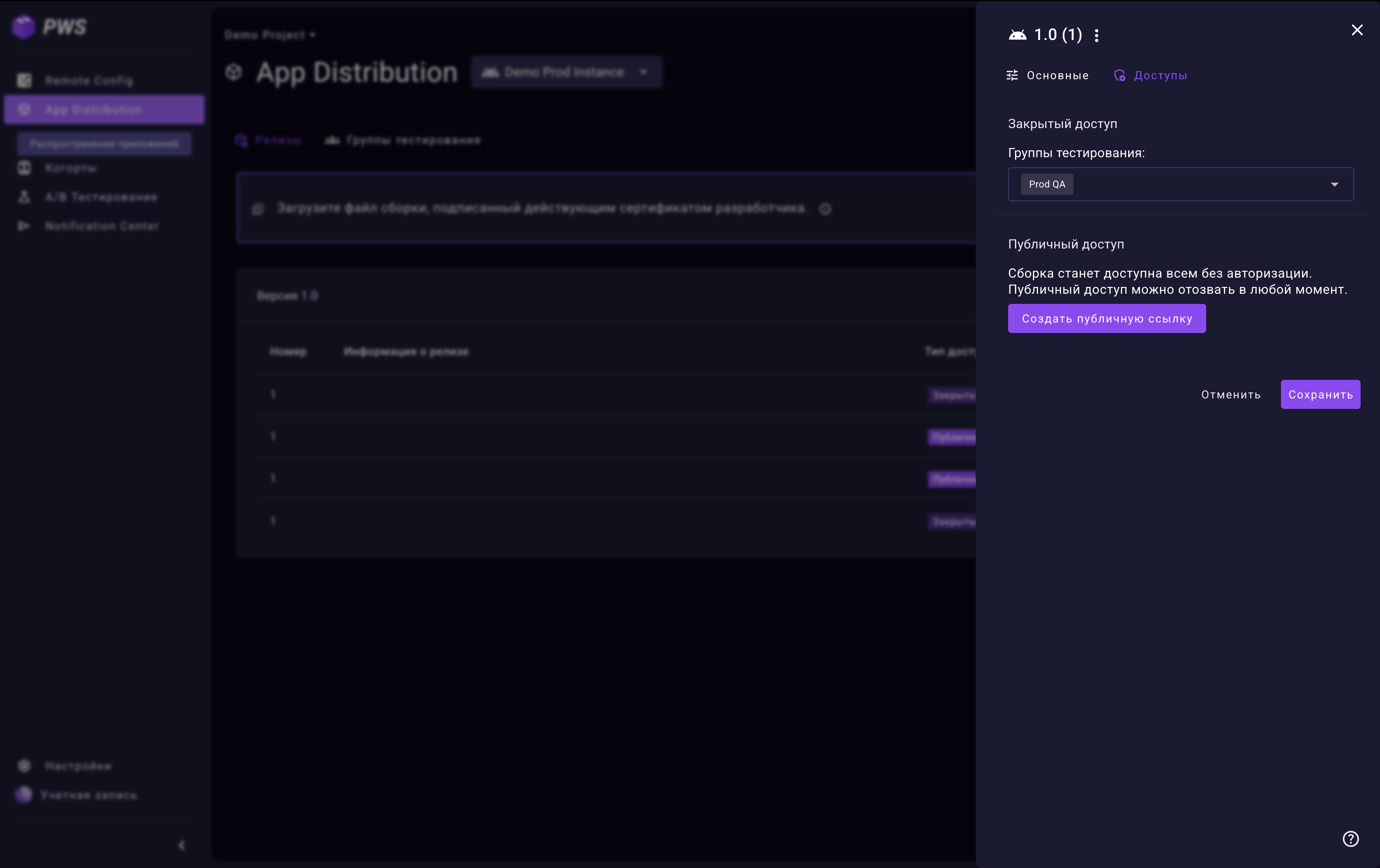 Закрытый доступ — выберите группы тестирования, которым будет доступна сборка, и сохраните настройки.