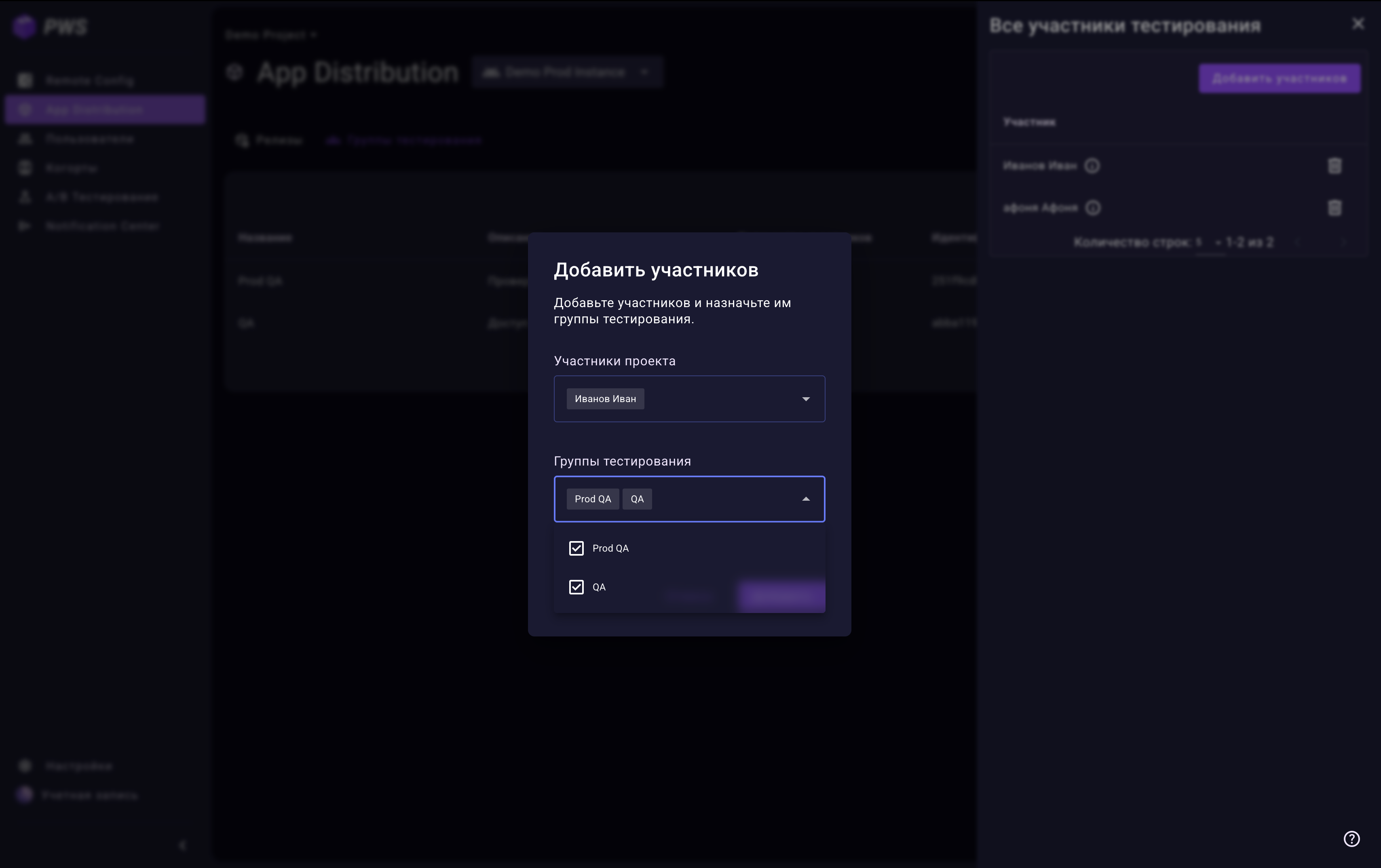 В группу можно добавить только пользователей проекта с ролями App Distribution Admin, App Distribution Editor или App Distribution Viewer. Если нужного пользователя нет в списке, добавьте его в проект через вкладку Участники в настройках проекта.