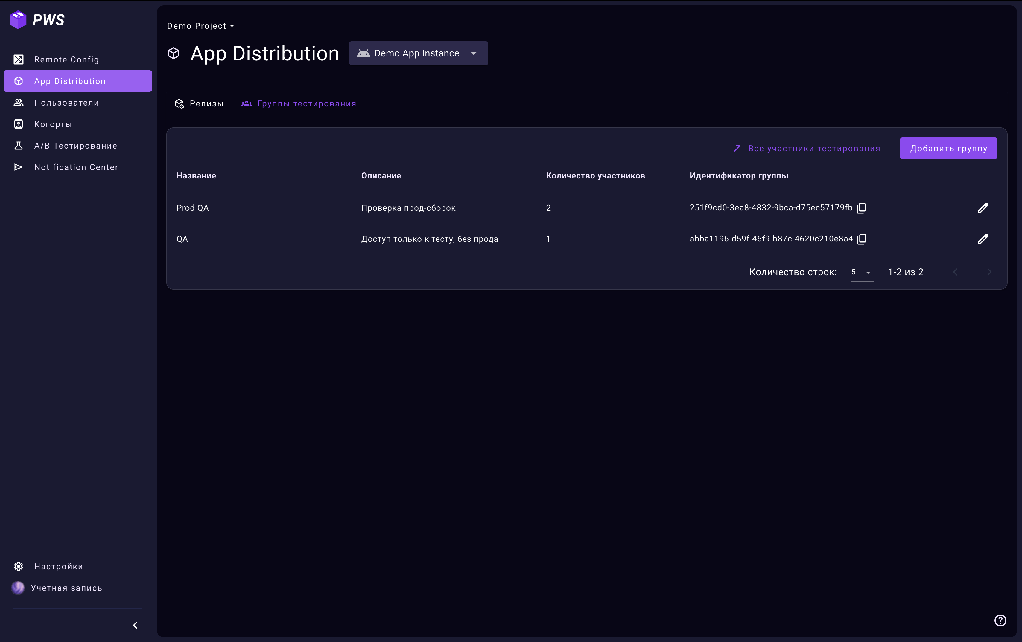 Перейдите в раздел App Distribution → Группы тестирования. В таблице отображаются все группы тестирования в проекте: